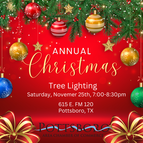 You are cordially invited to sponsor our annual holiday tree lighting festivities by displaying your logo and company information around the tree, visible for all to see! You will also receive your logo featured on the Pottsboro Chamber website.