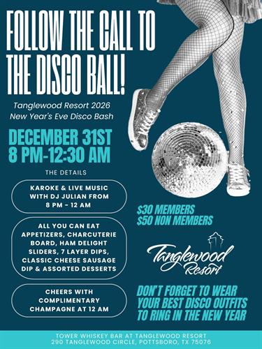 Get ready to ring in 2026 in style at the Tanglewood Resort New Year's Eve Disco Bash! Put on your best disco outfits and dance the night away under the glittering disco ball.